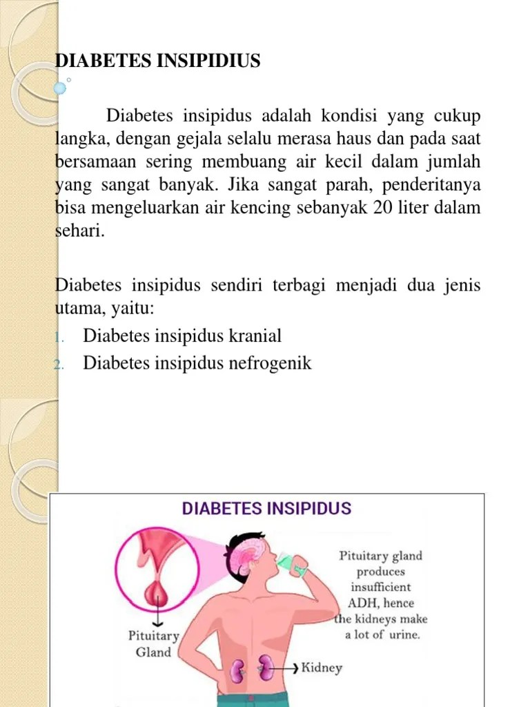 Diabetes insipidus adalah kondisi yang ditandai dengan selalu merasa haus dan sering buang air kecil dalam jumlah banyak, bahkan hingga 20 . Dikutip dari alodokter, pasien yang mengalami penyakit ini akan menghasilkan urine dalam jumlah berlebihan sehingga akan lebih sering merasa . Penderita diabetes tipe 1 harus menerima suntikan insulin seumur hidupnya. Diabetes insipidus adalah penyakit yang disebabkangangguan hormon antidiuretik atau adh yang. Padahal tidak semua penyakit dengan .